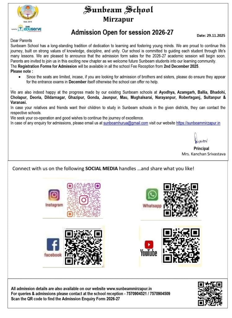 Sunbeam School has always been dedicated to nurturing young minds with strong values of knowledge, discipline, and unity. We are excited to announce that admission forms for the 2026-27 academic session will be available from 2nd December 2025 at all school fee reception counters.